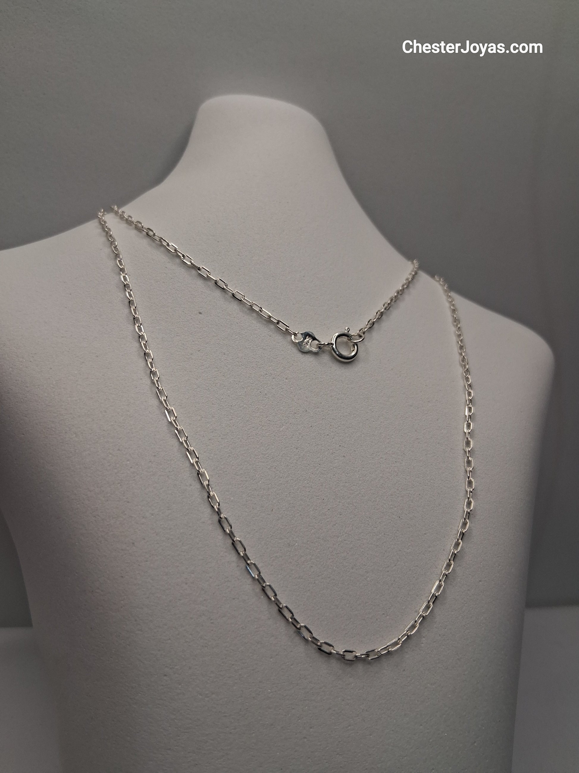 La cadena en la imagen es una cadena de plata con un eslabón de tipo rectangular alargado. Además, se puede observar que tiene una etiqueta con la inscripción "925", lo que indica que es de Plata de ley 925, es decir, contiene 92.5% de Plata pura y 7.5% de otros metales aumentándole durabilidad. Se le conoce comúnmente como Plata esterlina.