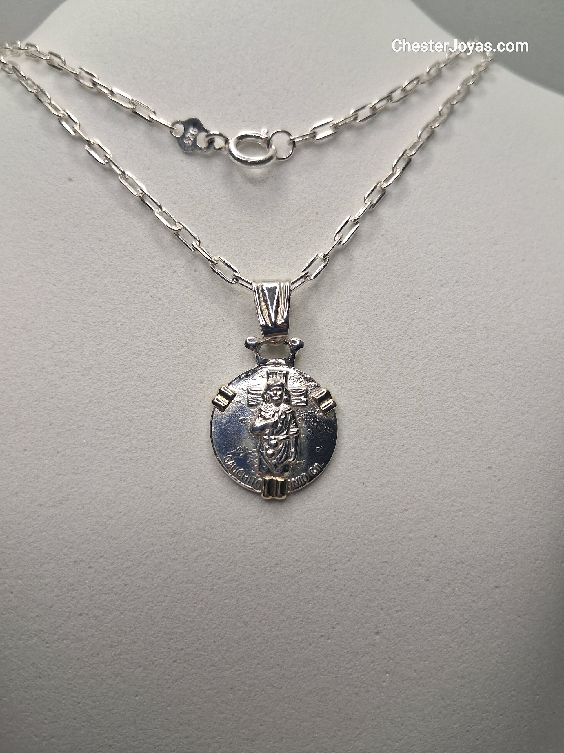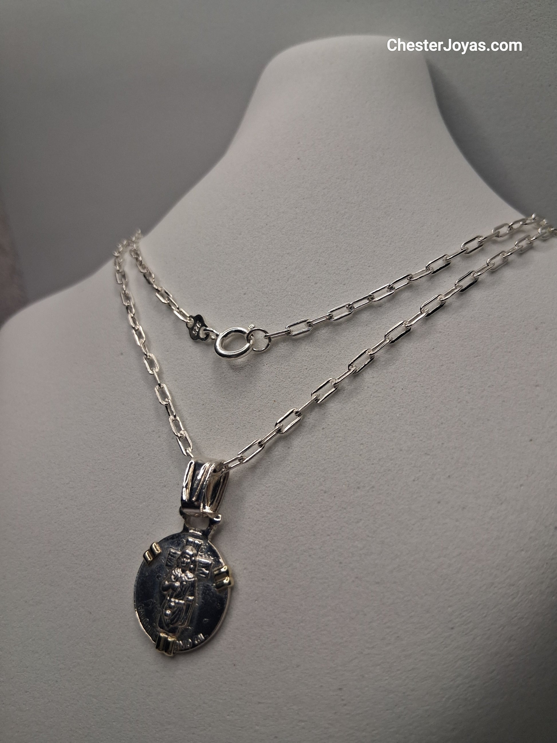 La cadena en la imagen es una cadena tipo eslabón de caja, también conocida como cadena de eslabones rectangulares. El dije tiene una forma ovalada y presenta una imagen del Gauchito Antonio Gil, El borde exterior del dije tiene un diseño decorativo que enmarca la imagen central.