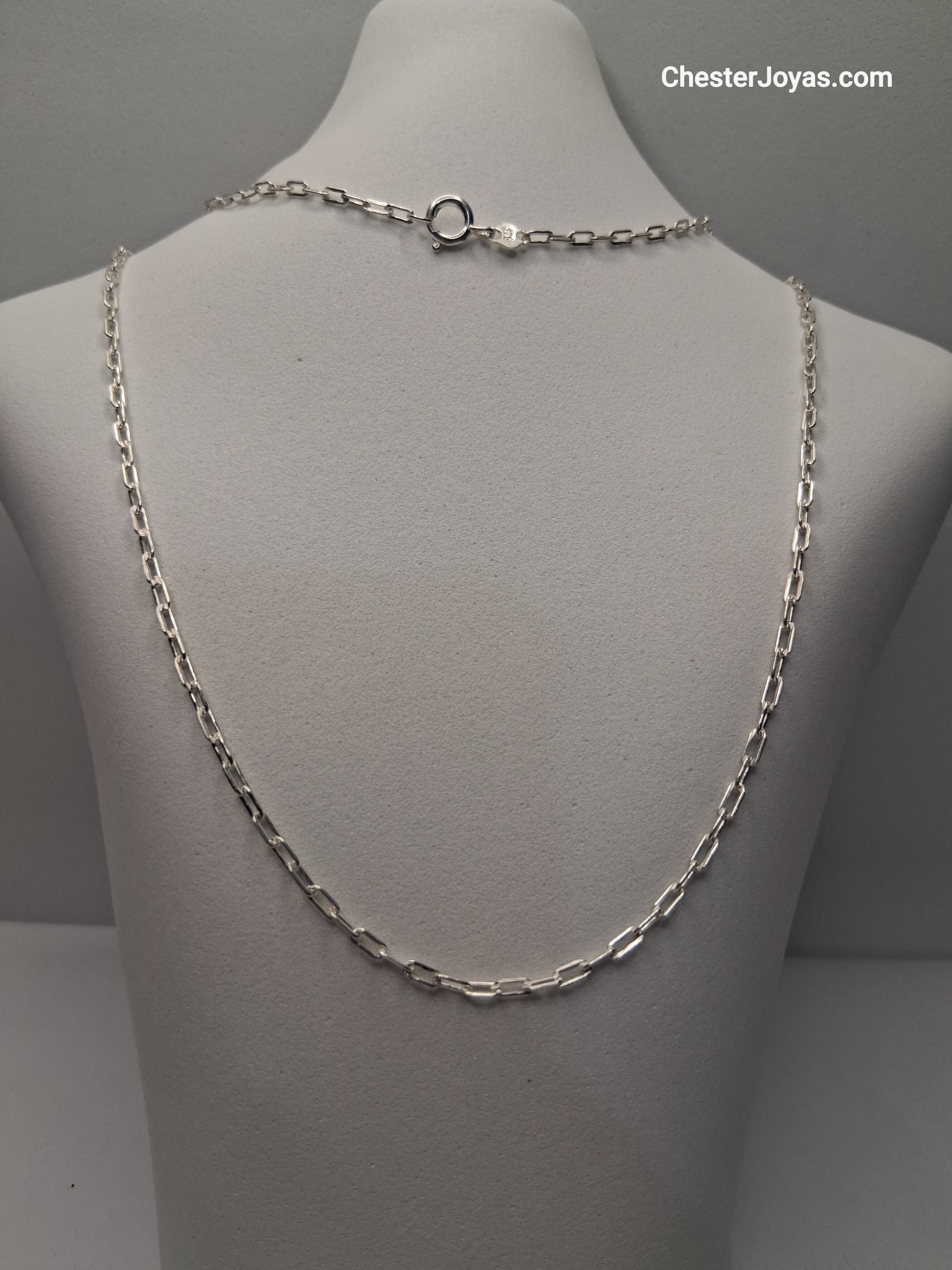 La cadena en la imagen es una cadena de Plata con un eslabón de tipo rectangular alargado. Además, se puede observar que tiene una etiqueta con la inscripción "925", lo que indica que es de Plata de ley 925, es decir, contiene 92.5% de Plata pura y 7.5% de otros metales aumentándole durabilidad. Se le conoce comúnmente como Plata esterlina.