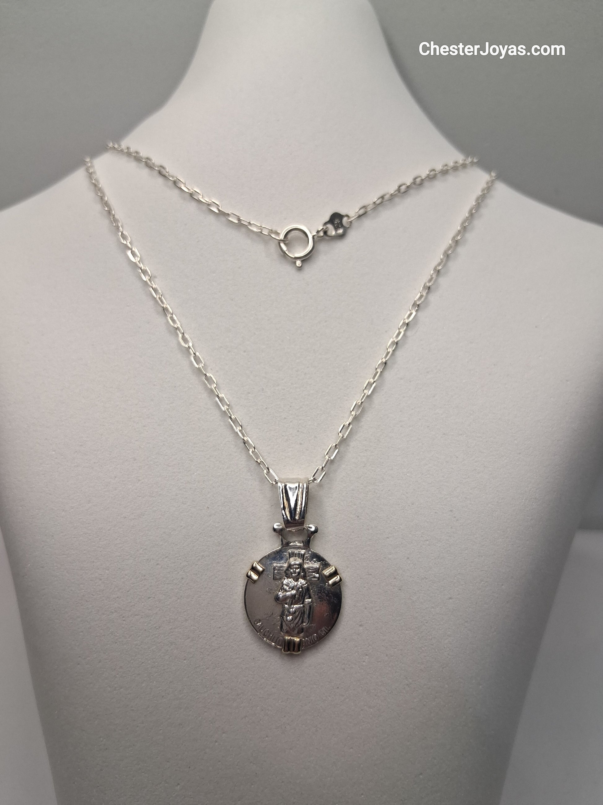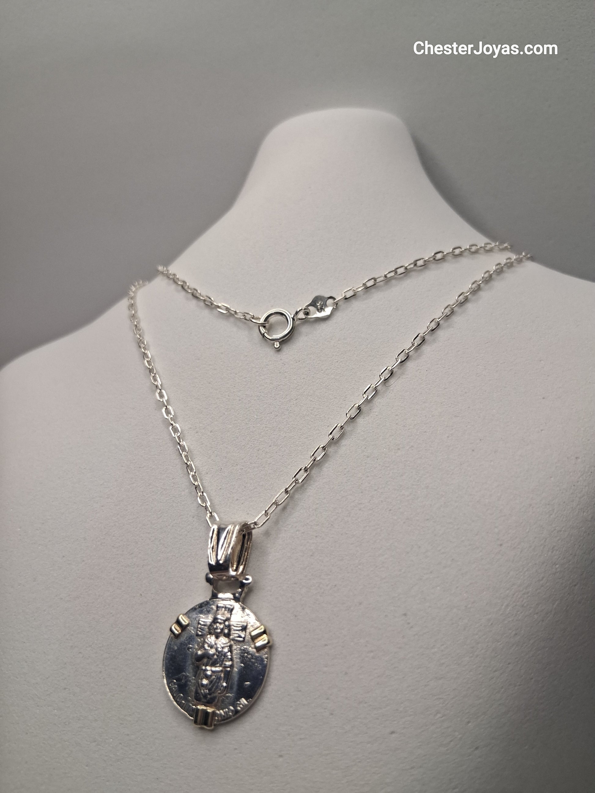 La cadena en la imagen es una cadena tipo eslabón de caja, también conocida como cadena de eslabones rectangulares. El dije tiene una forma circular y presenta una imagen del Gauchito Antonio Gil, El borde exterior del dije tiene un diseño decorativo que enmarca la imagen central.