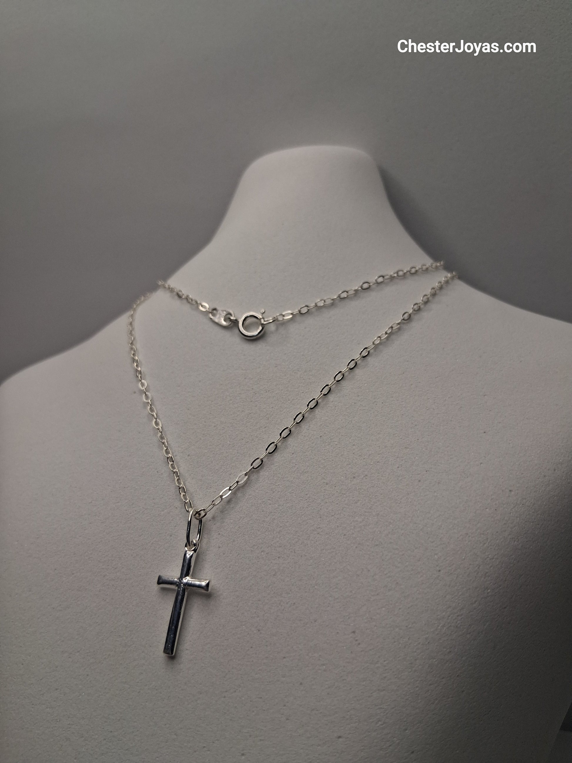 La imagen muestra una cadena y un dije. La cadena es una de eslabones rectangulares, también conocida como cadena "forcet". El dije tiene la forma de una cruz simple y lisa.