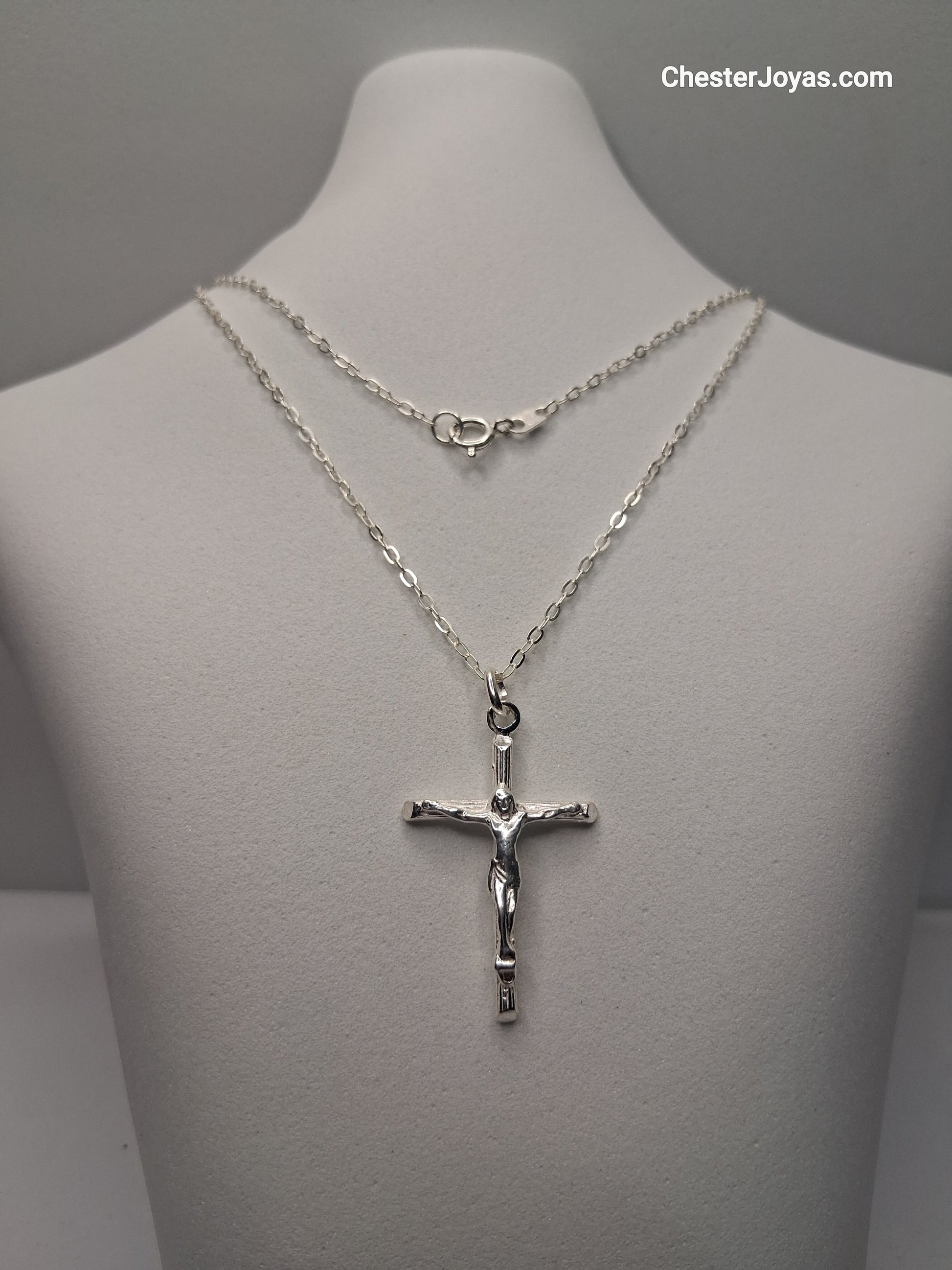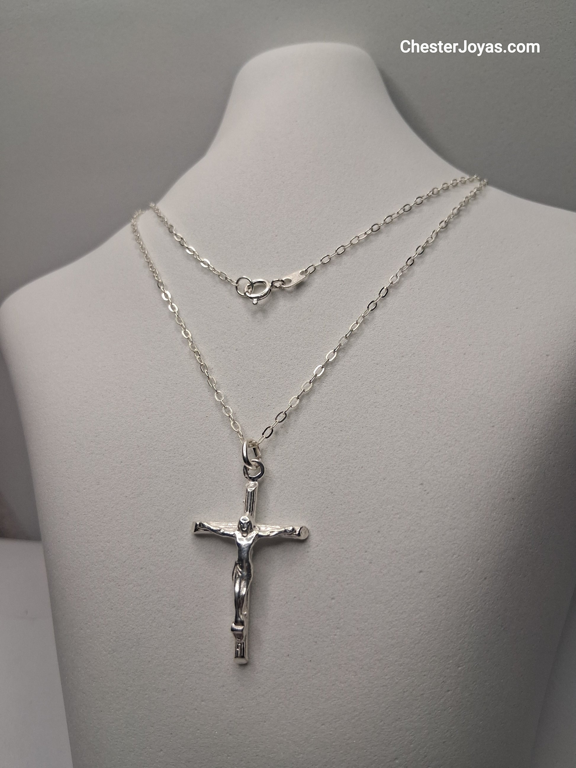 La imagen muestra una cadena y un dije. La cadena es una de eslabones rectangulares, también conocida como cadena "forcet". El dije tiene la forma de una cruz simple y lisa.