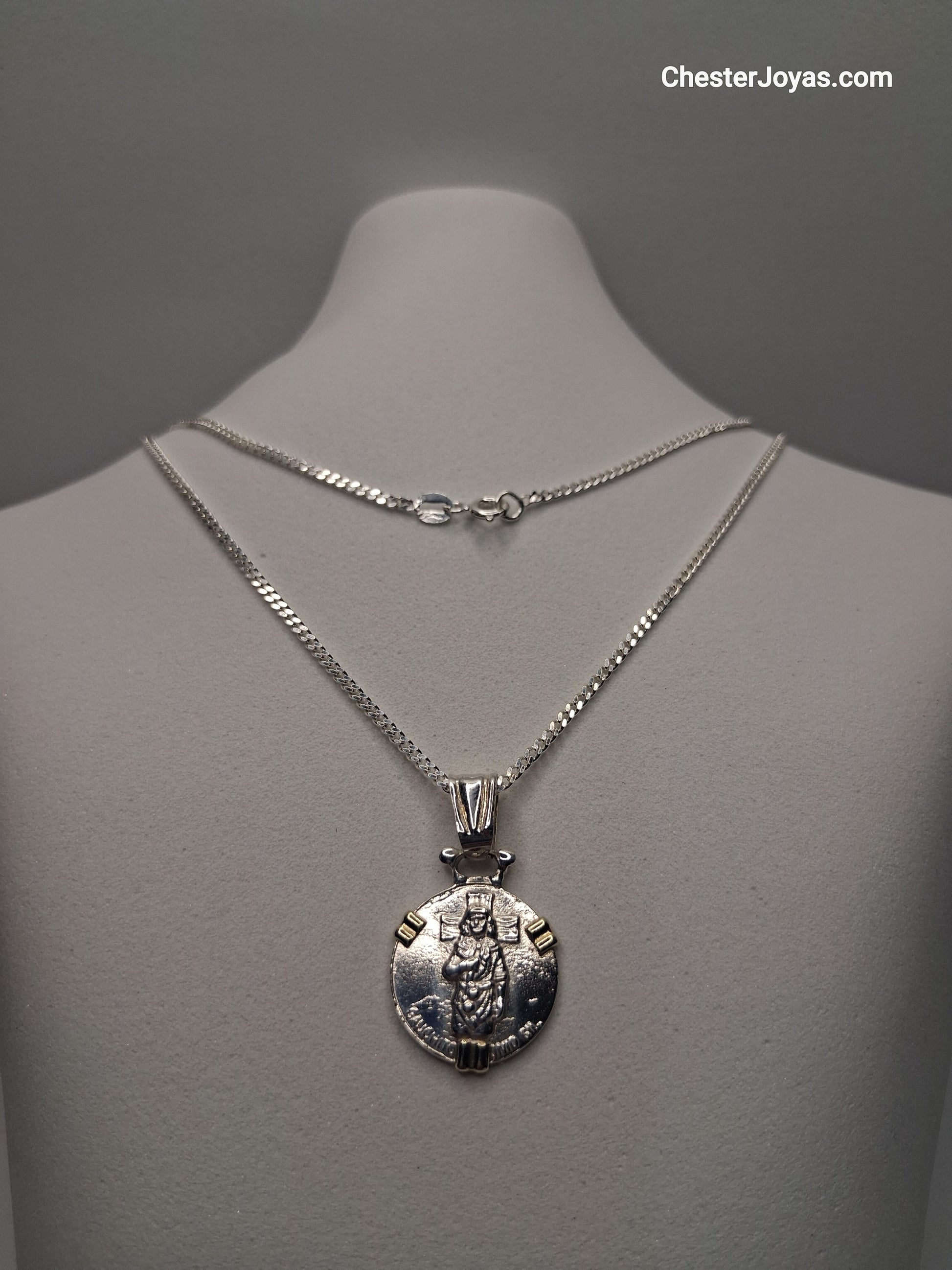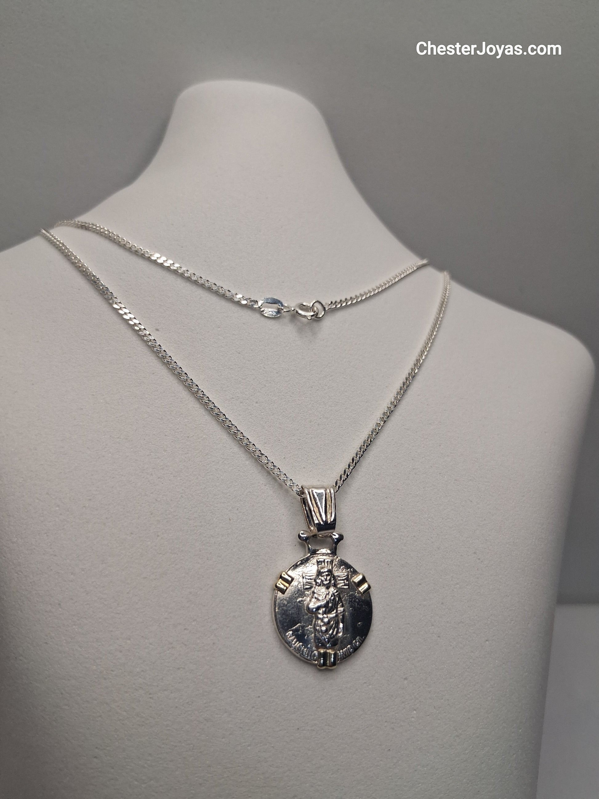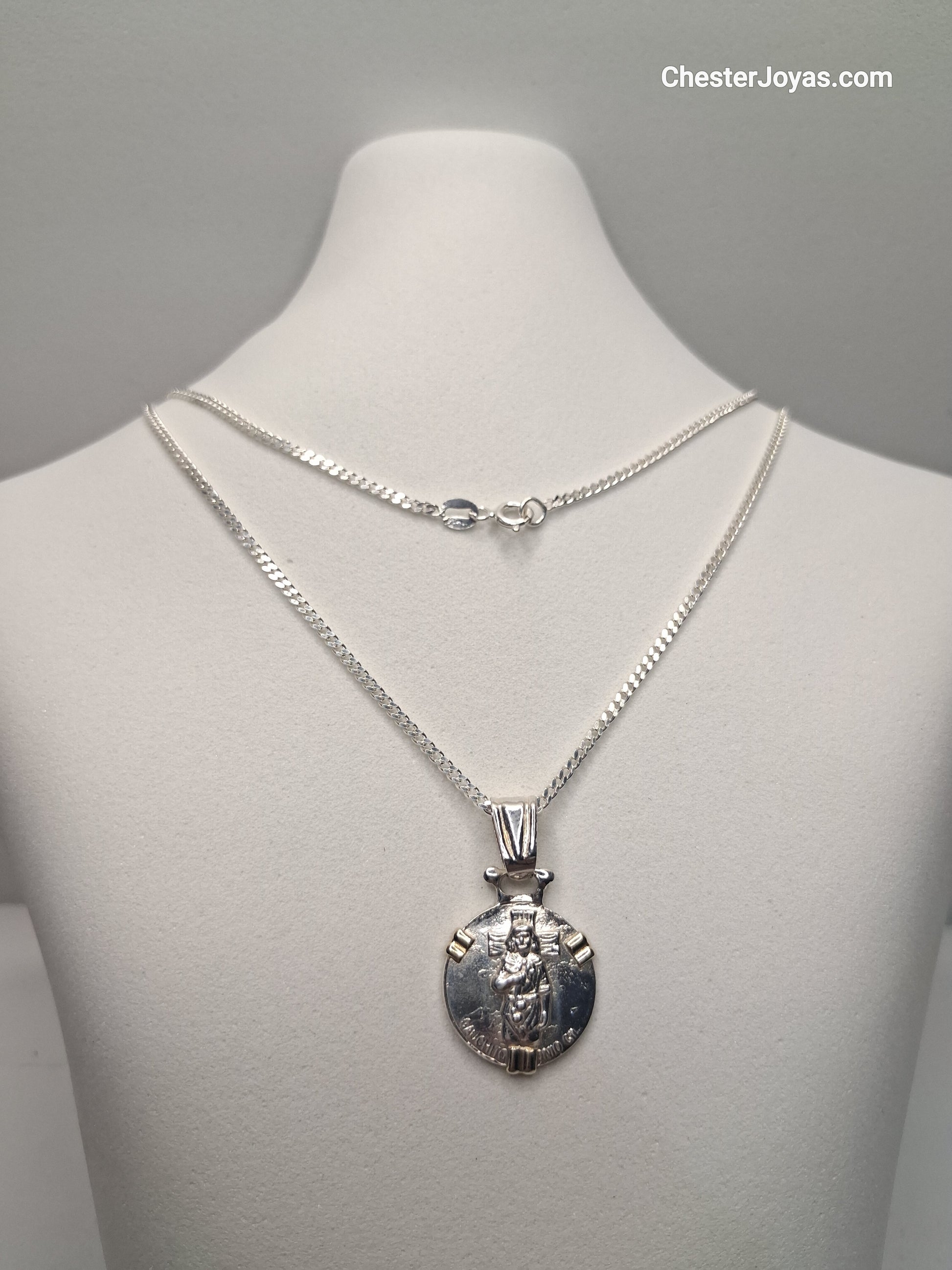 La cadena en la imagen es una cadena tipo eslabón, también conocida como cadena diamantada. El dije tiene una forma circular y presenta una imagen del Gauchito Antonio Gil, El borde exterior del dije tiene un diseño decorativo que enmarca la imagen central.