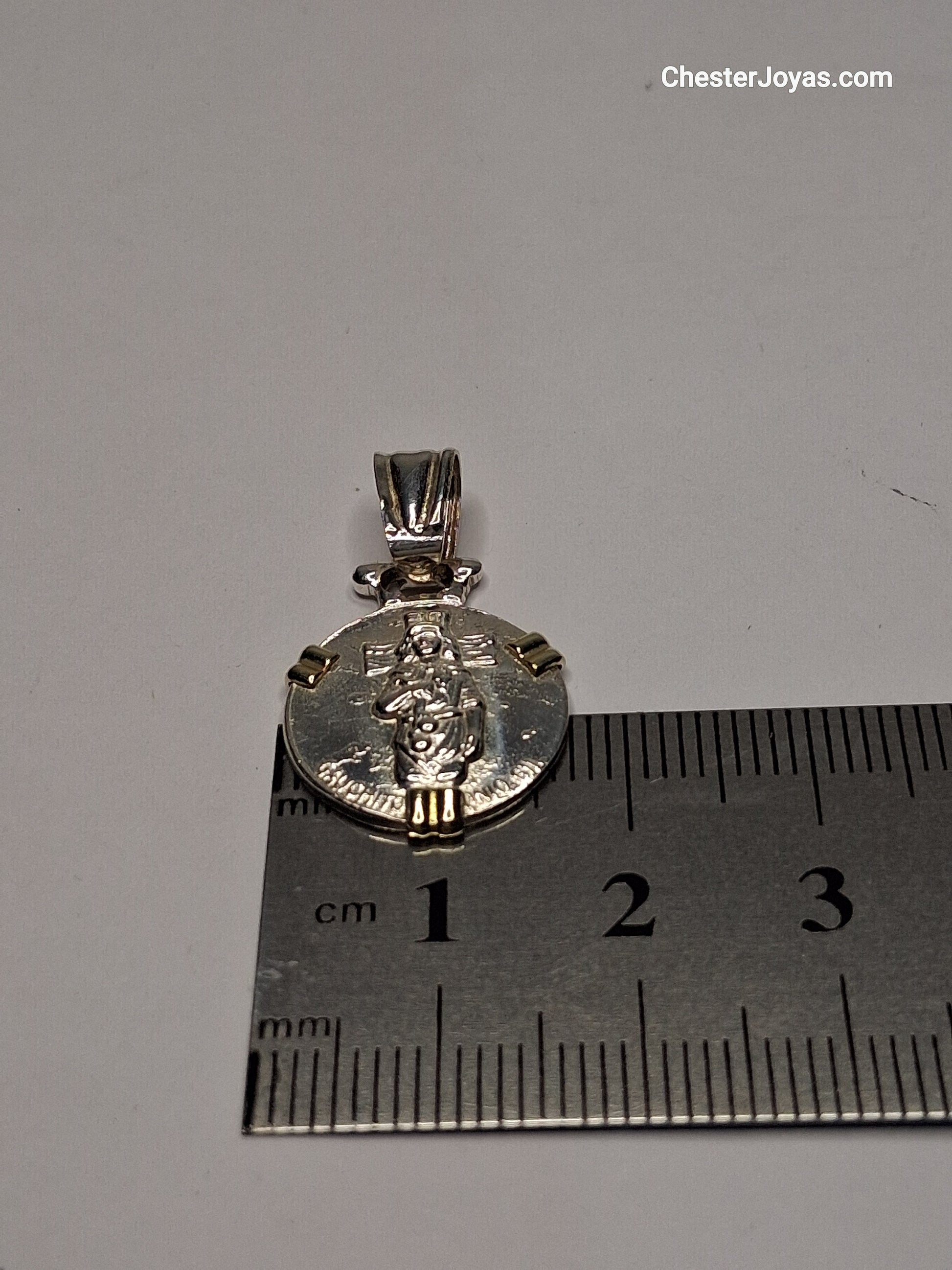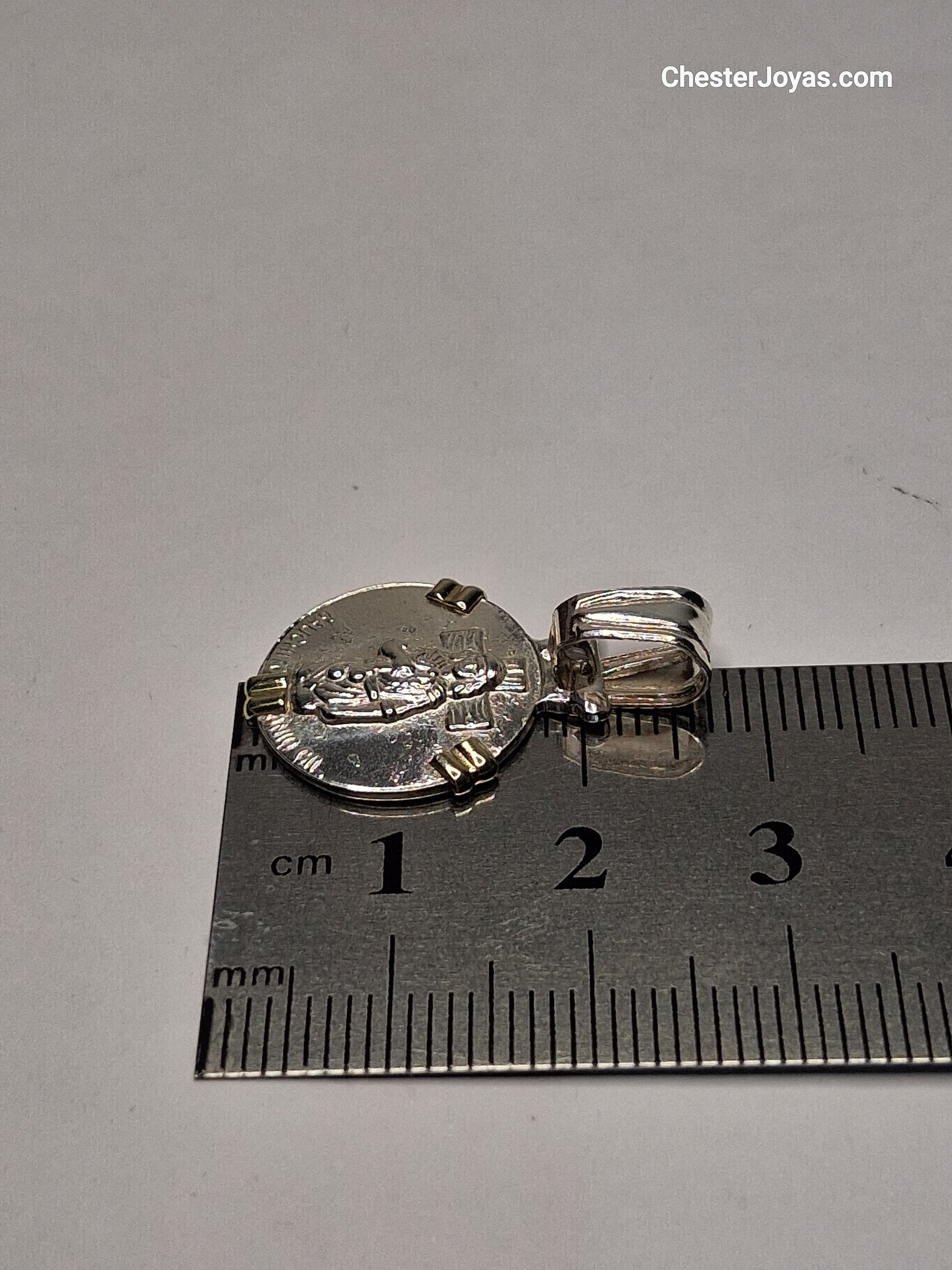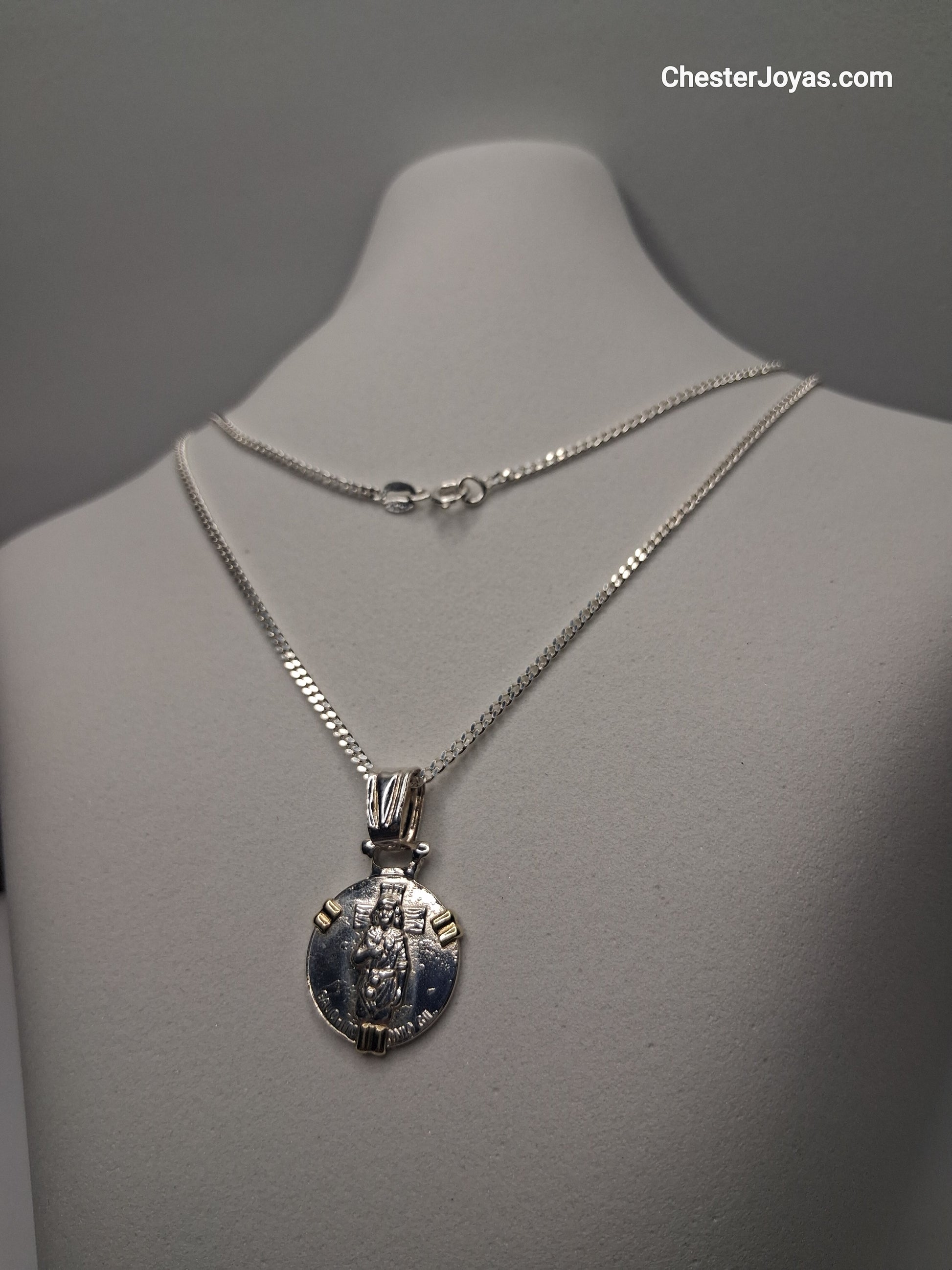 La cadena en la imagen es una cadena tipo eslabón, también conocida como cadena diamantada. El dije tiene una forma circular y presenta una imagen del Gauchito Antonio Gil, El borde exterior del dije tiene un diseño decorativo que enmarca la imagen central.